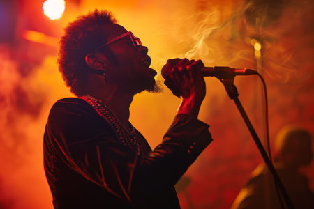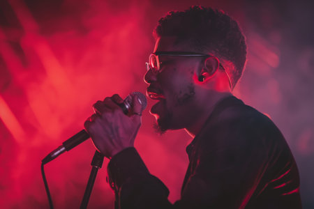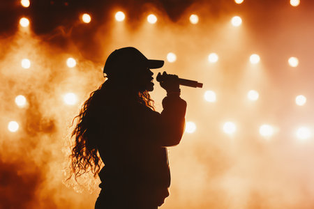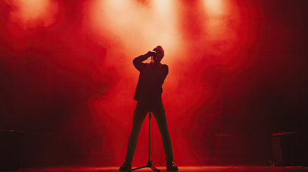 Captivating silhouette of a passionate singer belting out a powerful note, set against vibrant stage lights that enhance the electric atmosphere.