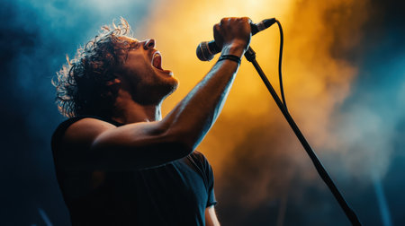 Young male singer passionately performing live on a vibrant stage, illuminated by colorful spotlights and filled with atmospheric smoke, creating a captivating concert experience