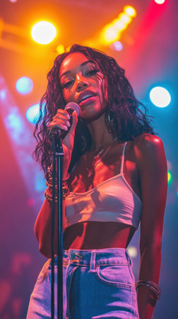 Captivating afro female singer delivering energetic performance on stage with microphone