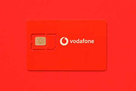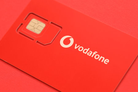 KHARKIV, UKRAINE - FEBRUARY 11, 2023: Vodafone starter pack on a red background.