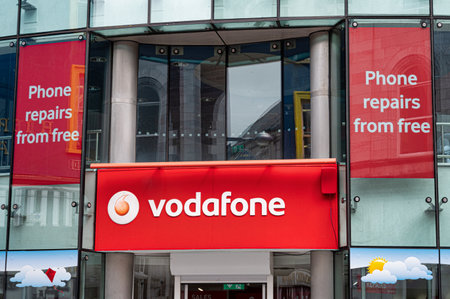 Cork, Ireland- July 14, 2021: The sign for Vodafone store in Cork city