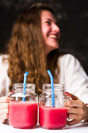 Ice refreshing summer drink with berry and lemon on abstract blue background.