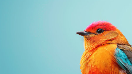 A stunning image of a bird gracefully soaring in the sky, capturing the essence of freedom and tranquility. The colorful wings spread wide against a serene blue background.