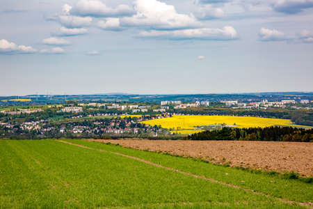Summer morning in Krusne mountains over Chomutov town with color meadows and fences