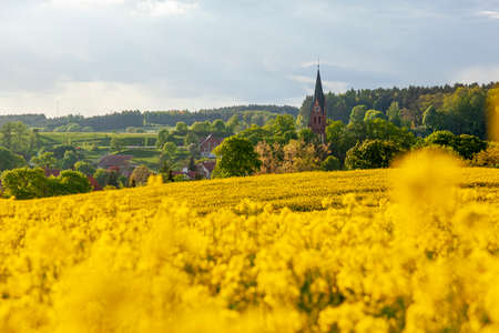 Gietrzwald - a village in Warmia and Mazury, Poland - spring landscape, blooming rapeseed. Basilica of the Nativity of the Blessed Virgin Mary in Gietrzwald.