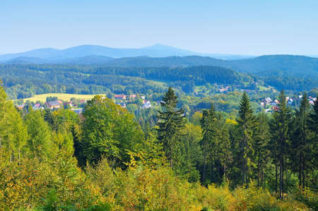 Beautiful view of a typical kneeling on the peaks in Hruby Jesenik, North Moravia, Czech Republic. Morning view of the villages of Mala Moravka and Karlov pod Pradedem. Typical Czech landscape. Green and blue.