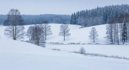 Winter landscape with snow covered trees and lake in Bavaria, Germany