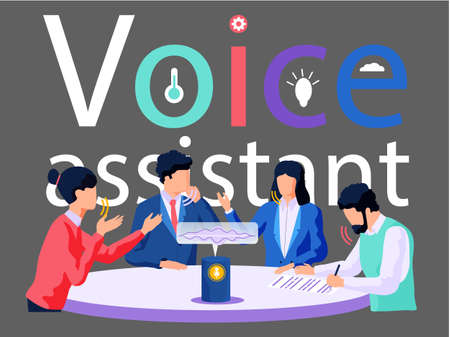 Voice assistant banner. Smart speaker with voice recognition flat vector inscription for websites on blue background. Smart speaker recognizes voice commands and controls smart home devices