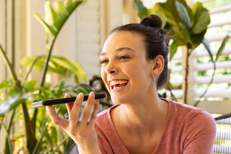 Smiling woman using smartphone voice assistant while relaxing at home with plants. Technology, communication, smart home, AI, relaxation, lifestyle