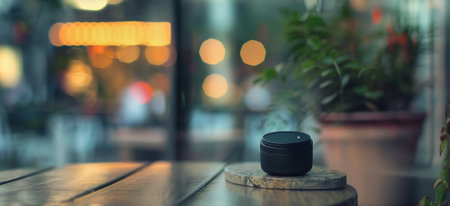 A closeup of a smart speaker resting on a table its LED indicators pulsing softly. The device integrates with augmented reality with holographic controls and monitoring features hoverin
