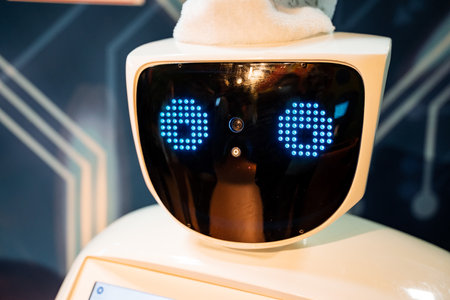 MOSCOW, RUSSIA - OCTOBER 12, 2018: 3D Print Expo - white robot with blue eyes at technology exhibition. Future, kawaii and robotic concept