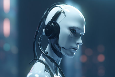 robotic female singing robot performing on a microphone, showcasing a cyberpunk-inspired imagery with a white background. this creative commons attribution photo, taken with a nikon d750, captures the elegantly formal and layered gestures of the robot, resembling human anatomy. ai generated