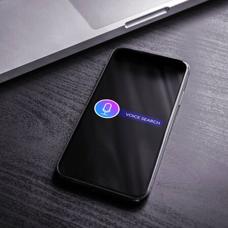 Voice recognition, speech detect application and search technology concept. Close-up smartphone application with microphone icon and voice search text.
