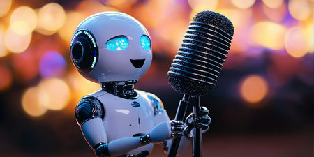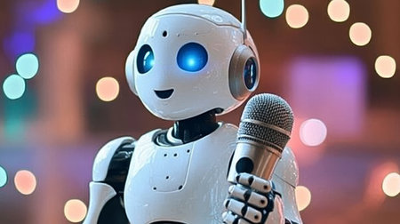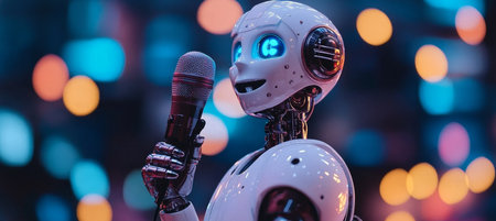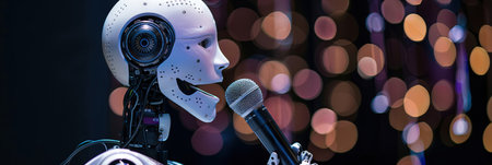 Robot with microphone on stage in front of bokeh background