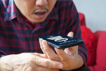 close up young asian man holding smartphone to talking by voice recognition application to communicate with friends or family for people lifestyle concept