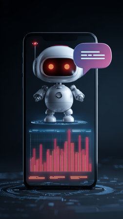 Cute robot with glowing eyes and speech bubble displayed on smartphone screen with digital data chart