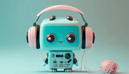 AI robot is listening to music on its headphones floating, isolated on a soft blue and Pink Pastel