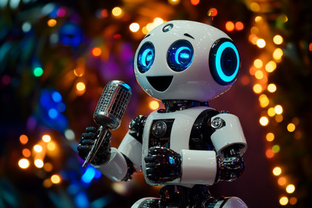 Cheerful Android Singing into a Retro Style Microphone Surrounded by Colorful Festive Lights