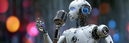 Futuristic Singing AI Robot Performing on Stage with Colorful Bokeh Lights and Classic Microphone