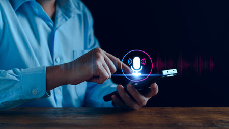 A young man holds a smartphone close to his mouth to record a voice message or use a virtual assistant while a blue digital sound wave and processing text appear on the illuminated screen at night.