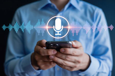 A handsome man in a blue shirt holds a smartphone near his mouth while speaking to a digital voice assistant visualized by a glowing microphone icon and blue audio sound waves.