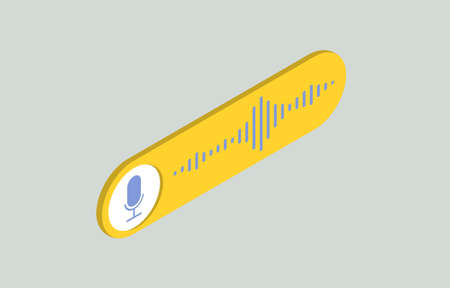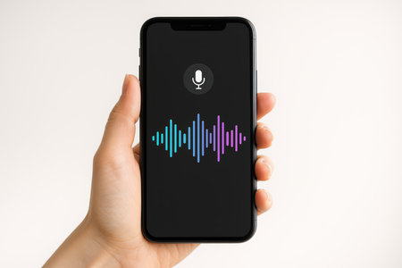Voice control concept on smart phone screen. Hand holding smartphone with voice assistant icon.