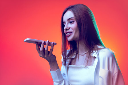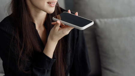 Woman holding smartphone device, using voice recognition function, recording audio message or talking with mobile assistant. Authentication, communication, online technology concept