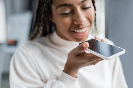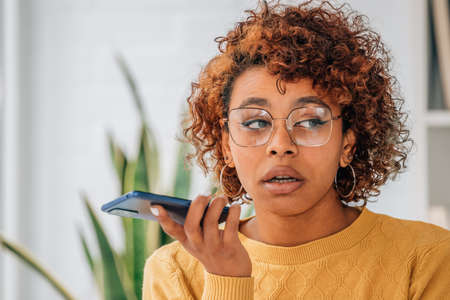 Happy black woman using voice assistant on smart phone at home