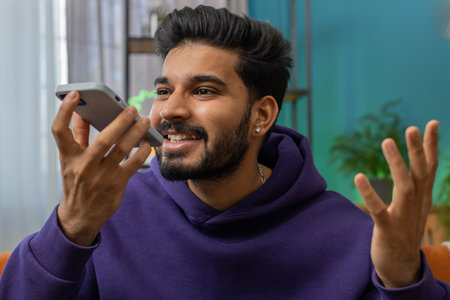 Closeup of happy arab man recording voice mail on smartphone