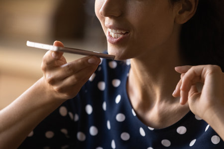 Close up Arabian woman record voice message on speaker phone talking use loudspeaker microphone recording voicemail speaking with AI mobile assistance Indian girl businesswoman talk cellphone at home