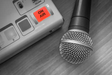 Professional audio mixer console with black knobs to equalize sounds. Audio recording studio tool. Music and entertainment concept