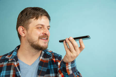 young man with mobile phone sending or recording voice message