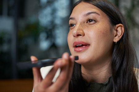 Young Woman Using Voice Assistant in Modern Cafe During Afternoon