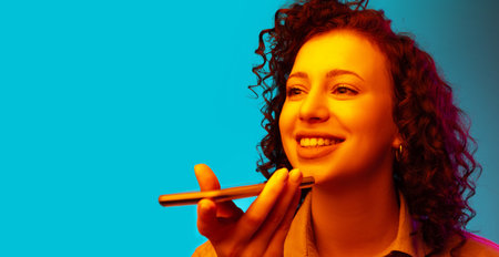 Cropped close-up studio image of young beautiful girl isolated over blue background in neon light. Recording voice message