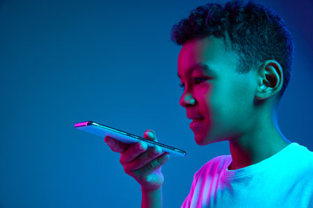 Rear view photo. Teen boy holding phone near mouth as if using voice assistant in colorful neon light against gradient studio background. Concept of technology, smart interaction, youth communication