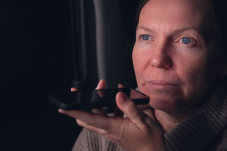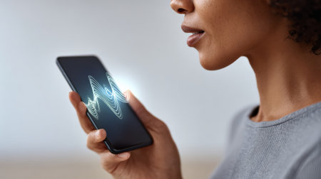 Woman holding smart phone talking with digital assistant.
