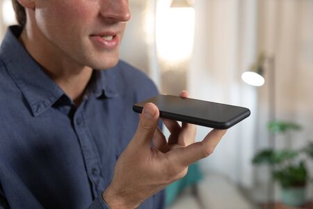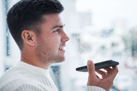 Young man using voice search on smartphone indoors, closeup