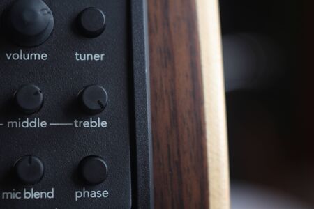 Music equipment closeup. Management console sound design at the event. Big black mixer with control knobs.
