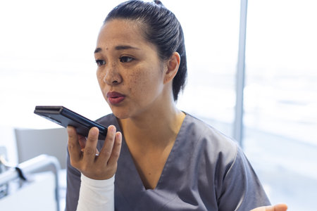 Portrait asian korean woman girl recording voice recognition message on speakerphone lady female at home using virtual assistant app sets reminder on phone at home office digital ai mobile assistance