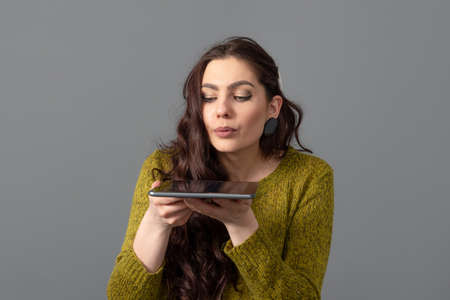 Woman holding smartphone device, using voice recognition function, recording audio message or talking with mobile assistant. Authentication, communication, online technology concept