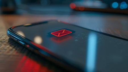 A phone with a red email icon on the screen. The phone is on a wooden table. Scene is serious and focused