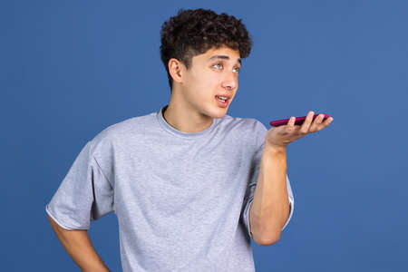 Caucasian young mans half-length portrait on blue studio background. Beautiful male model in shirt. Concept of human emotions, facial expression, sales, ad. Copyspace. Recording voice message.