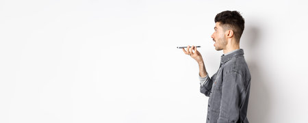Profile of young man speaking at smartphone, translate with voice-translator app, talking into mobile phone speakerphone, standing on white background