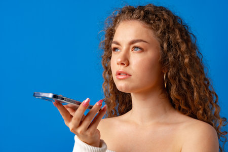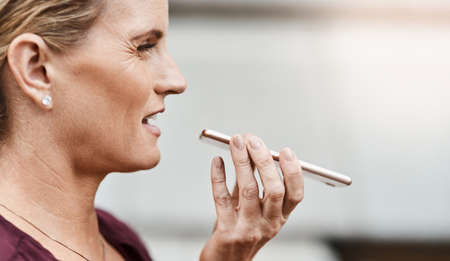 Woman holding smartphone device, using voice recognition function, recording audio message or talking with mobile assistant. Authentication, communication, online technology concept