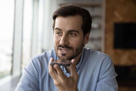 Head shot happy young man recording audio message on smartphone, sending voicemail, holding loudspeaker conversation with colleague or friends or web surfing information using virtual assistant app.