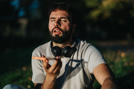Young woman with wireless headphone is using her smartphone to send a voice message to a new social network Clubhouse standing somewhere outdoors at the park