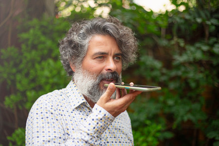 Mature businessman talking on mobile phone he standing at office and recording audio message on the phone