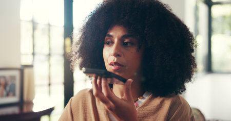 Woman, talking and speaker with phone in home for communication, conversation or discussion. African person, user or recording with mobile smartphone for voice note, chat or audio message in house