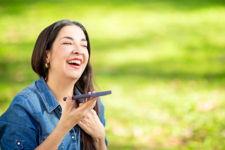 Smiling woman in a denim shirt sitting in a park with green grass and trees in the background, holding her smart phone close to her mouth while recording a voice message