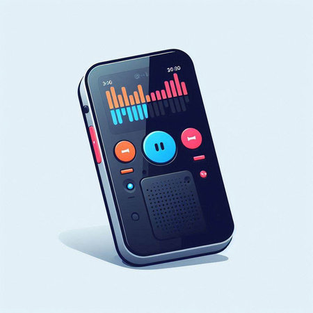 Audio guide online app on digital mobile smartphone screen with music headphones on neon background. Devices for listening audioguide to excursions